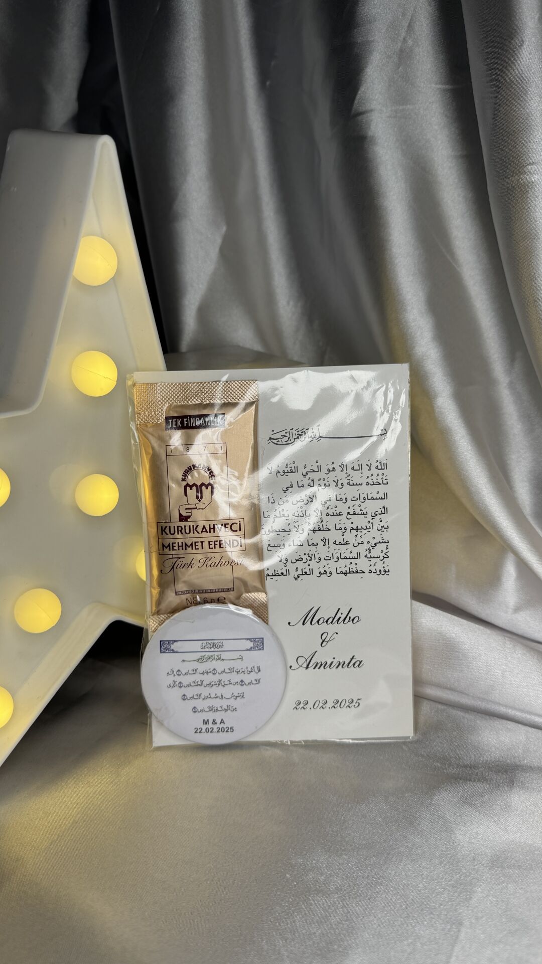 Size özel hazırlanan bu hediyelik, geleneksel Türk kahvesi sunumuyla manevi bir anlamı birleştiriyor. Arapça Ayetel Kürsi duasının yer aldığı özel baskılı kart ve dua sticker’ı ile bütünleşen Kurukahveci Mehmet Efendi tekli kahve paketi, nikah ve dini temalı organizasyonlar için ideal bir tercih sunar. Kişiye özel tarih ve isim detayıyla hazırlanır.