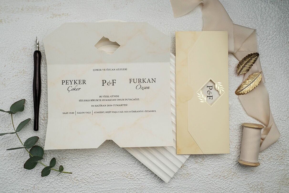 - Davetiye kutulu olarak tasarlanmış olup, zarf ve aksesuarları kutu içerisinde yer almaktadır.